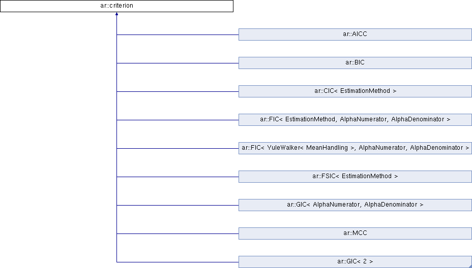 For details see either the FiniteSampleCriteria.tex write up or Broersen, P. M. T. "Finite sample criteria for autoregressive order selection." IEEE Transactions on Signal Processing 48 (December 2000): 3550-3558. http://dx.doi.org/10.1109/78.887047. A parent type for autoregressive model selection criterion.